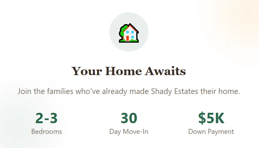 Important Disclosures: All pricing, financing terms, down payment amounts, and availability are subject to change without notice and contingent upon credit approval and program eligibility. Not all applicants will qualify for advertised financing terms. Photos, renderings, and home features shown may represent model homes, optional upgrades, or features not included in all available inventory. Community rules, pet policies, and occupancy requirements apply. All information provided is deemed reliable but not guaranteed. Prospective buyers are encouraged to verify all details, including home specifications, community amenities, pricing, and financing options with a Shady Estates representative prior to making any purchase decision.